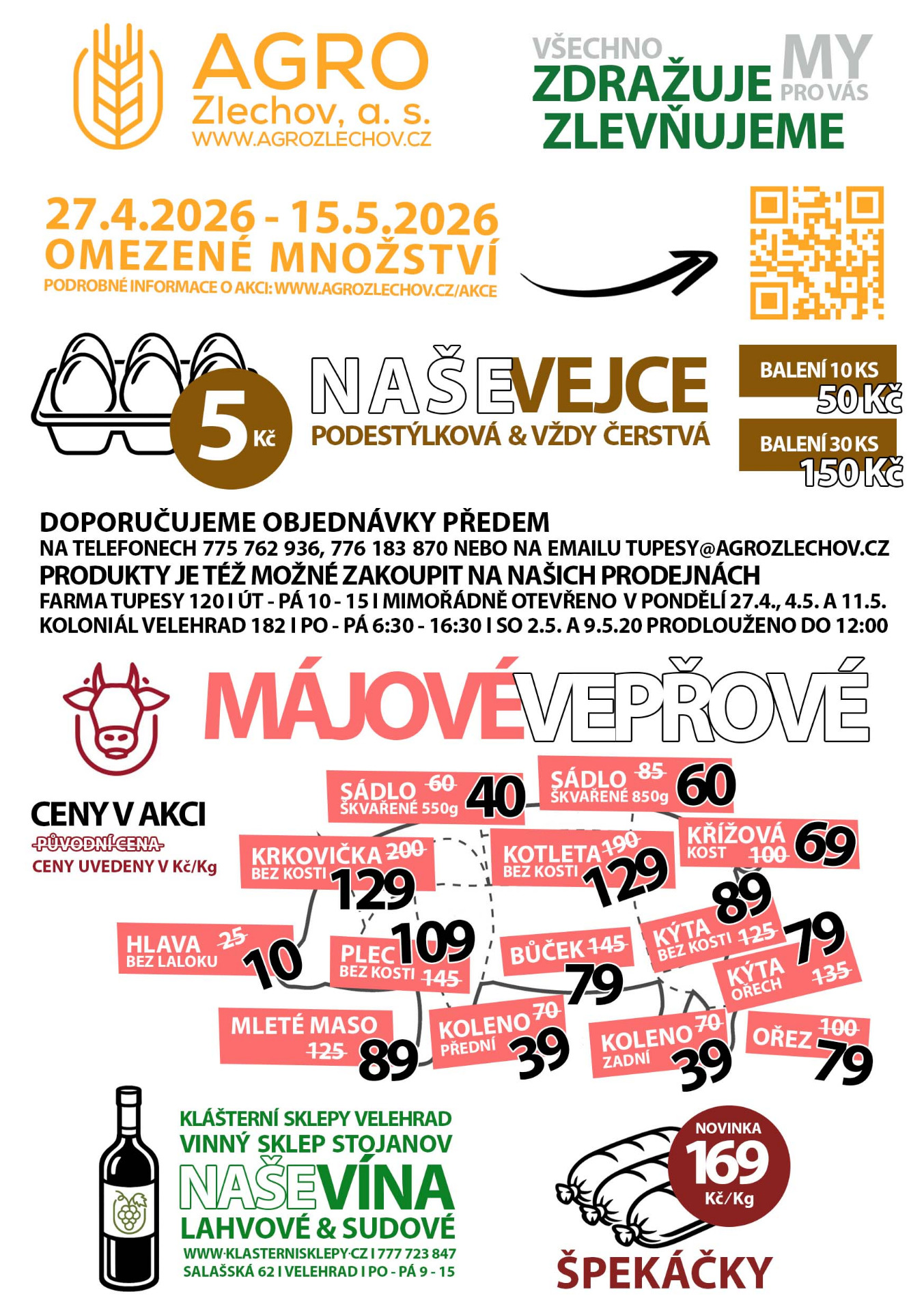 Nutné objednání předem na telefonu +420 773 071 087 (pokladna Zlechov), +420 776 183 870 (Koloniál), nebo na našich prodejnách do středy 22.4.2026.